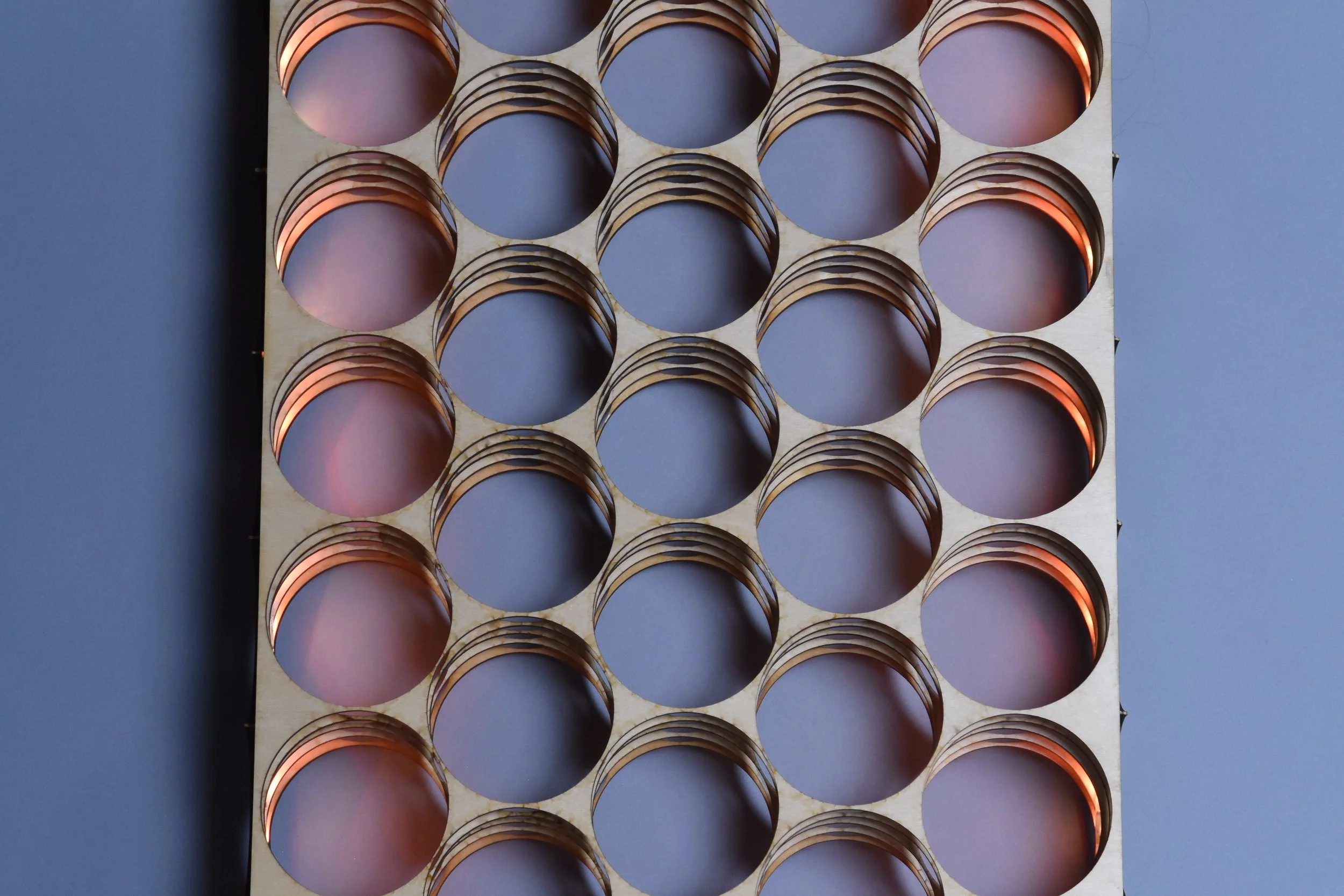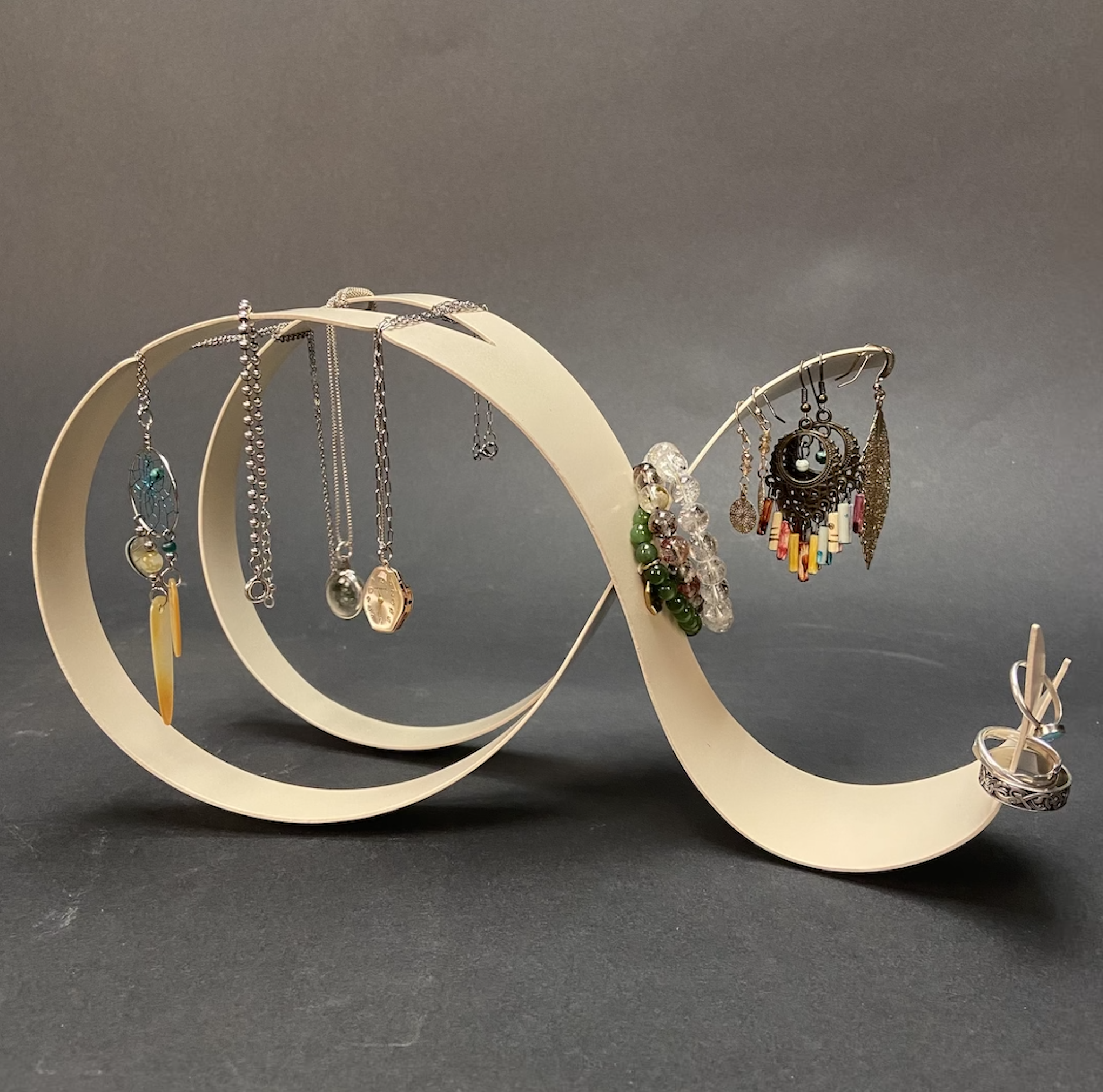 A three student team worked with EPOP to design an organically shaped jewelry display crafted from diverted aluminum materials. Sold at the Firefly Handmade Market, it combines sustainability with innovative, functional design.
